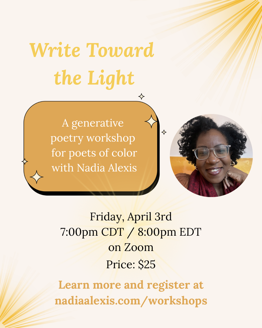 In this 100-minute generative poetry workshop for poets of color, we will gather in community to read and write poems that reach toward light, imagined worlds, community, tenderness, and love. The kind of poems that remind us of the power of words to transmute.